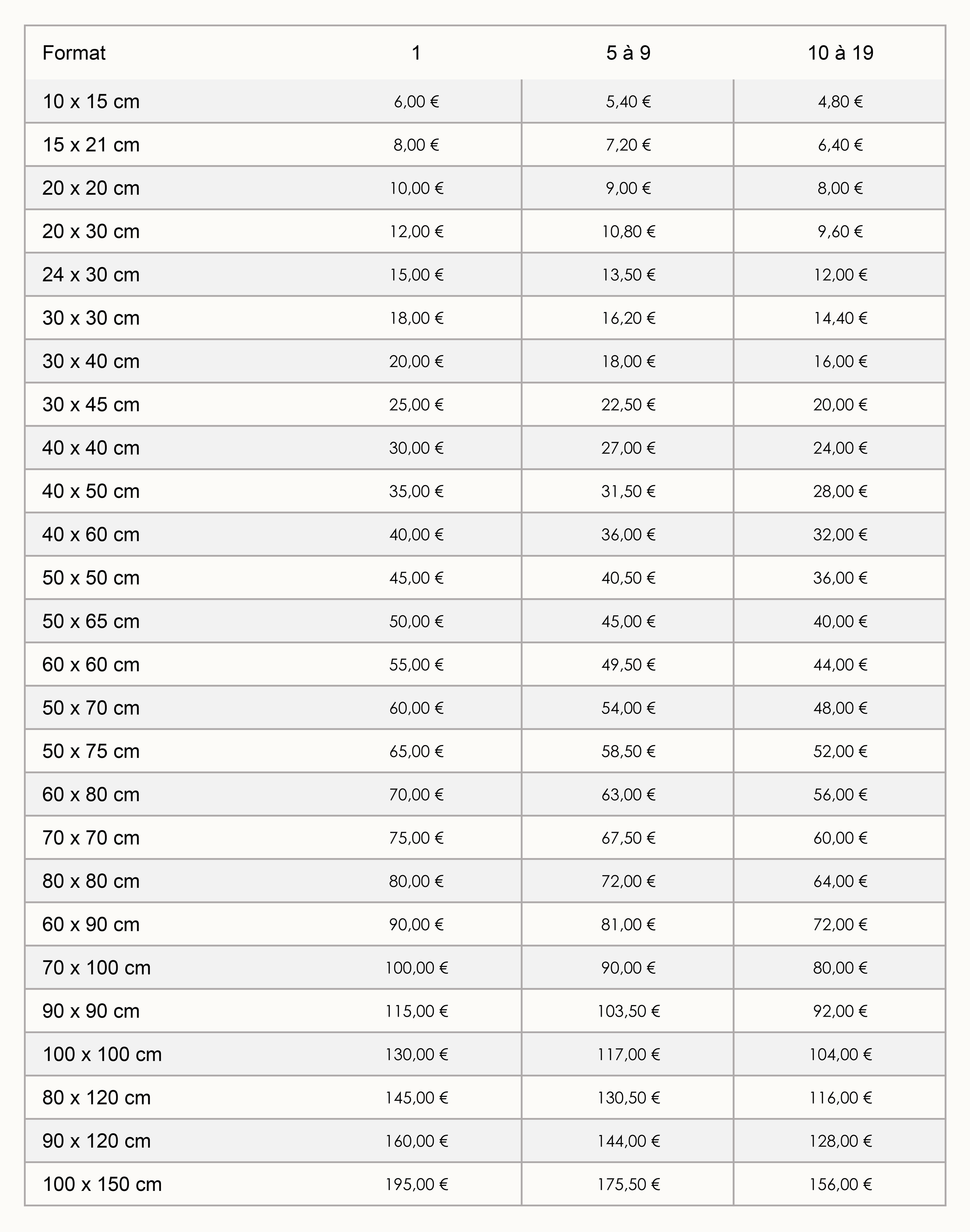 Tarifs Tirages Encres Pigmentaires :